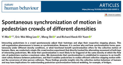 MA Yi, an associate professor atInstitute for DisasterManagement and Reconstruction (IDMR),Sichuan University,has revealed theoccurrence regularity of crowd synchronization behaviour and its functional benefits for human movement. The study was published in January 2021on journalNature Human Behaviour (IF=24.252)with the title ofSpontaneous synchronization of motion in pedestrian crowds of different densities.