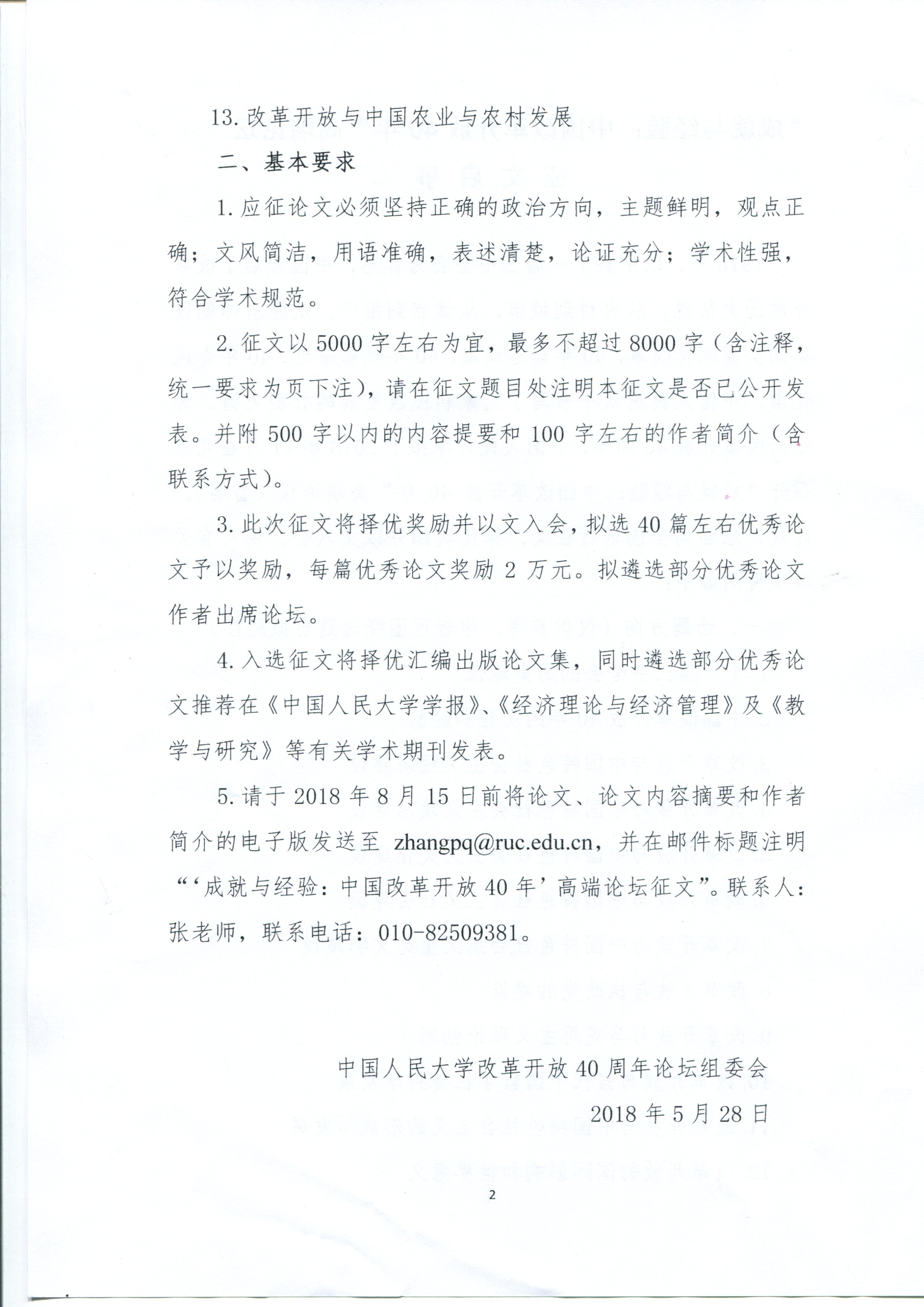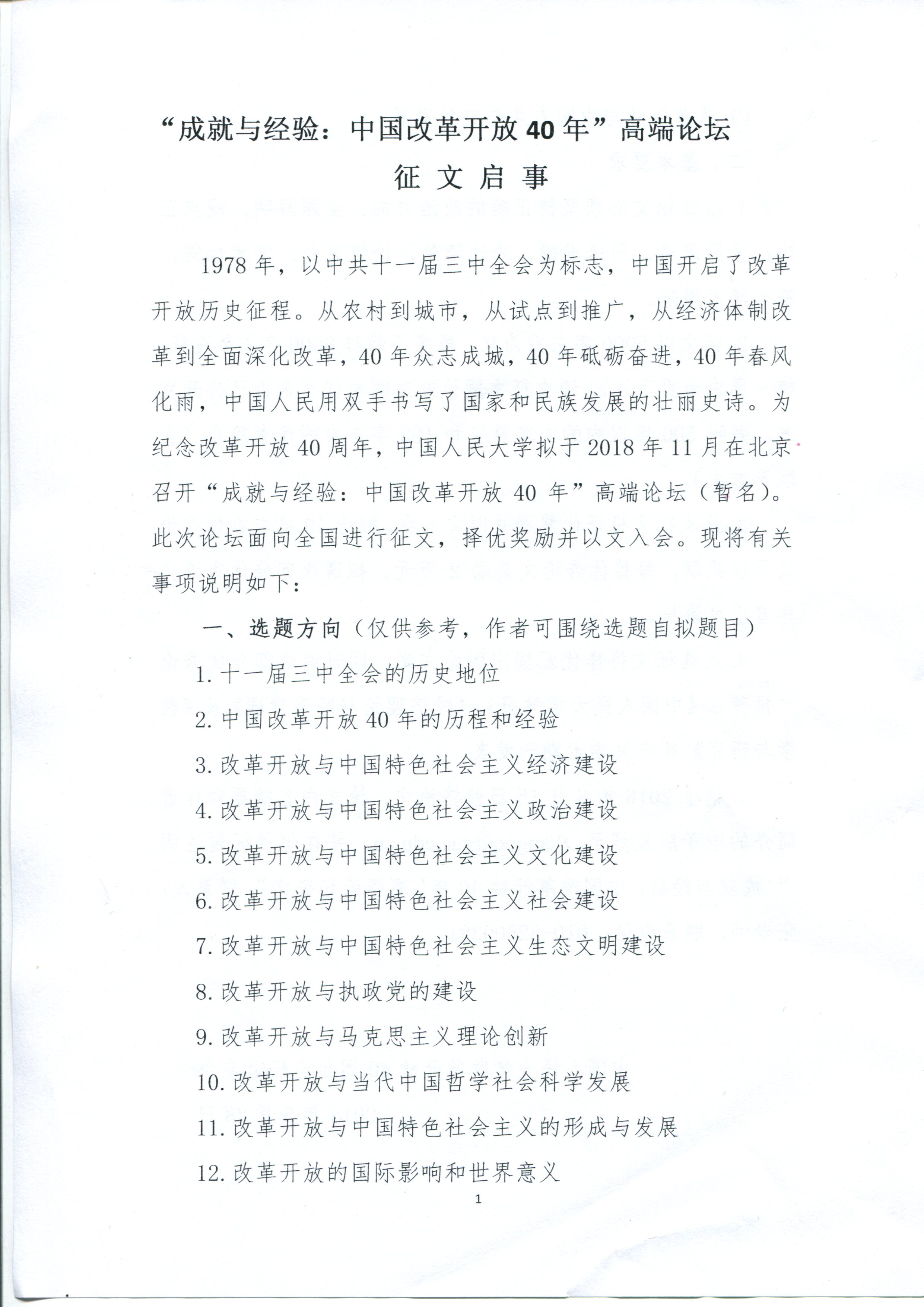 为纪念改革开放40周年,中国人民大学计划于2018年11月在北京召开“成就与经验:中国改革开放40年”高端论坛(暂名)。此次论坛面向全国进行征文,择优奖励并以文入会。具体内容见附件。