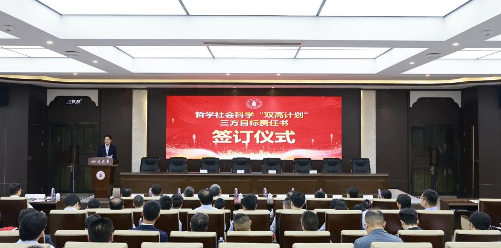 6月24日,学校在望江校区明德楼举行哲学社会科学“双高计划”三方目标责任书签订仪式。校党委书记甘霖、校长汪劲松等校领导,哲学社会科学“双高计划”入选团队负责人,相关单位主要负责人等参加会议。常务副校长褚良银主持会议,副校长刘超介绍哲学社会科学“双高计划”相关情况。